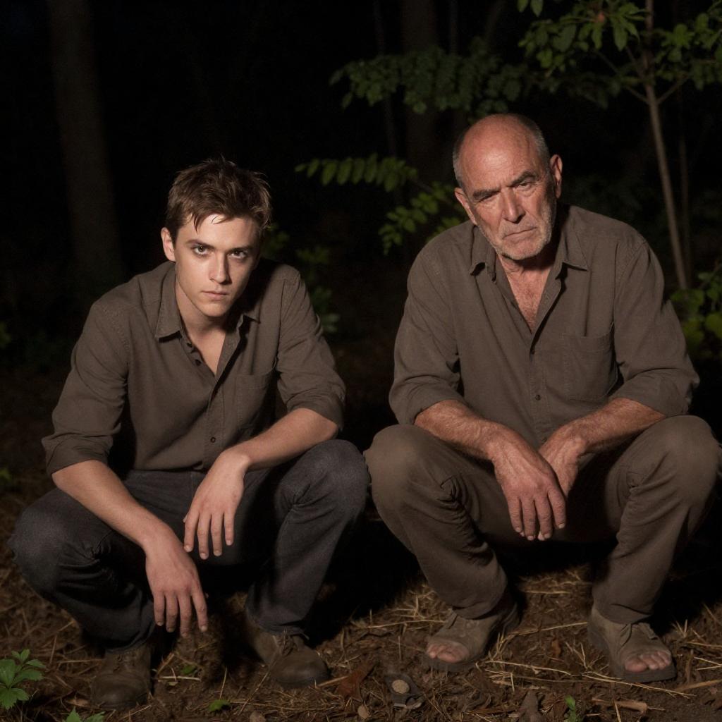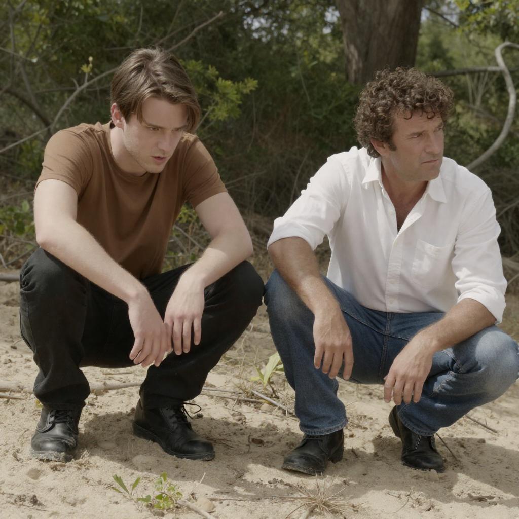 Photograph of two men sitting in a sandy, wooded area. Young man with brown hair, brown t-shirt, and black pants, crouched with hands on knees, looking down. Older man with curly brown hair, white button-up shirt, and blue jeans, crouched with hands on knees, looking to the right. Green foliage and trees in background, bright sunlight. Both men wear black boots. Sandy ground and sparse vegetation in foreground. Intense expressions on both faces. Two people. Casual, outdoor setting.