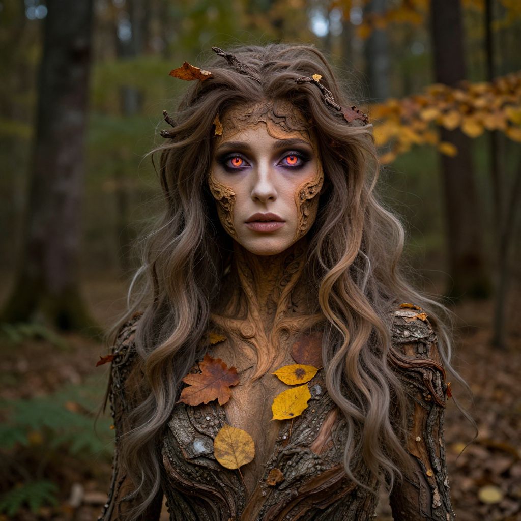 A photograph of a woman with long, wavy, brown hair adorned with autumn leaves. Her face is painted with intricate, gold patterns, and she has striking red eyes. She wears a dark, leafy, forest-inspired outfit with yellow and brown leaves scattered across it. The background is a blurred forest with tall trees and fallen leaves, creating a mysterious, autumnal atmosphere. Her expression is intense and otherworldly, evoking a fairy-tale or fantasy character. The image is rich in color and texture, emphasizing the natural, earthy elements.