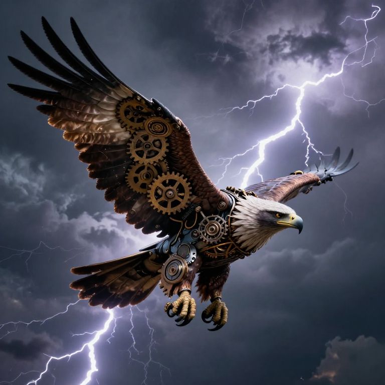 A steampunk-inspired eagle, its wings adorned with intricate gears and cogs, soars through a stormy sky illuminated by jagged bolts of lightning, defying the boundaries between nature and machinery.
