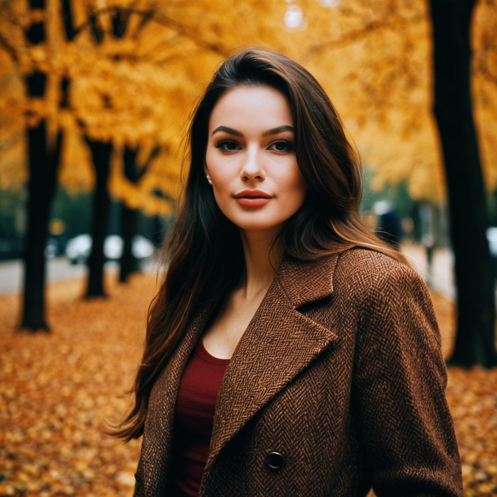 Elegant portrait of a woman with a slender physique, captured with a Canon EOS camera and 50mm f/1.2 lens, featuring rich autumn hues.