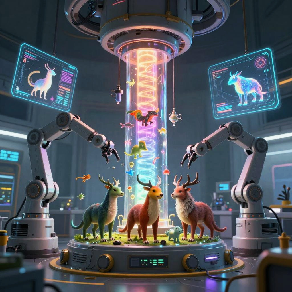 Animal.generator concept art depicting a futuristic machine creating vibrant, diverse animals in a high-tech laboratory, glowing tubes and holographic displays, sleek robotic arms assembling creatures, detailed digital painting with bright neon colors, sci-fi atmosphere