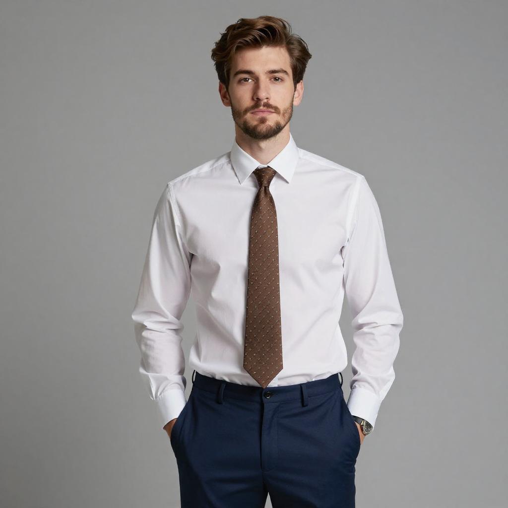 Portrait of a young adult Caucasian man with brown hair and beard, wearing a white long-sleeve dress shirt, brown patterned necktie, and dark blue formal pants. He stands against a plain gray background with hands in pockets, looking directly at the camera with a neutral expression.