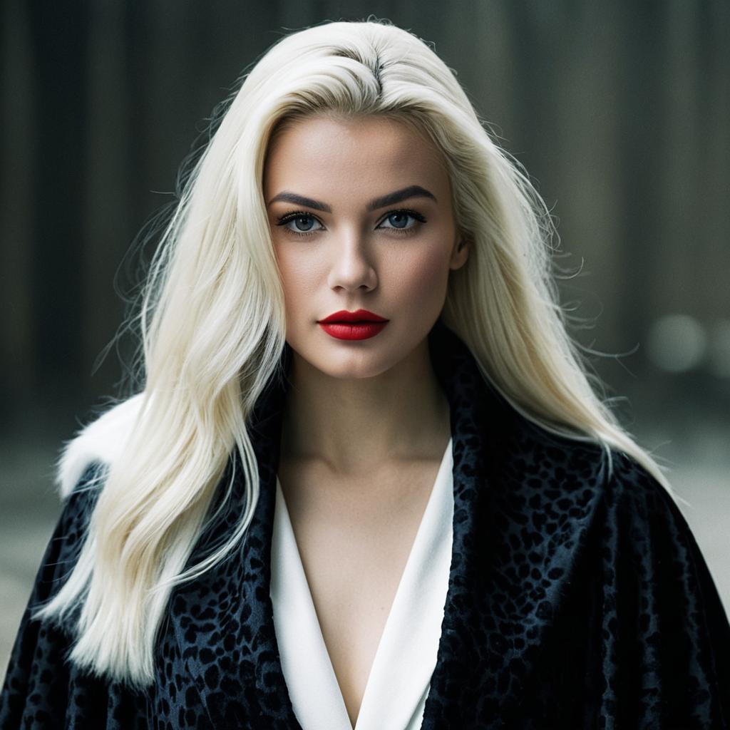 Cruella vil cloak ,1girl, solo, blonde hair, long hair, red lips, looking at viewer, realistic, robe, lips, blurry