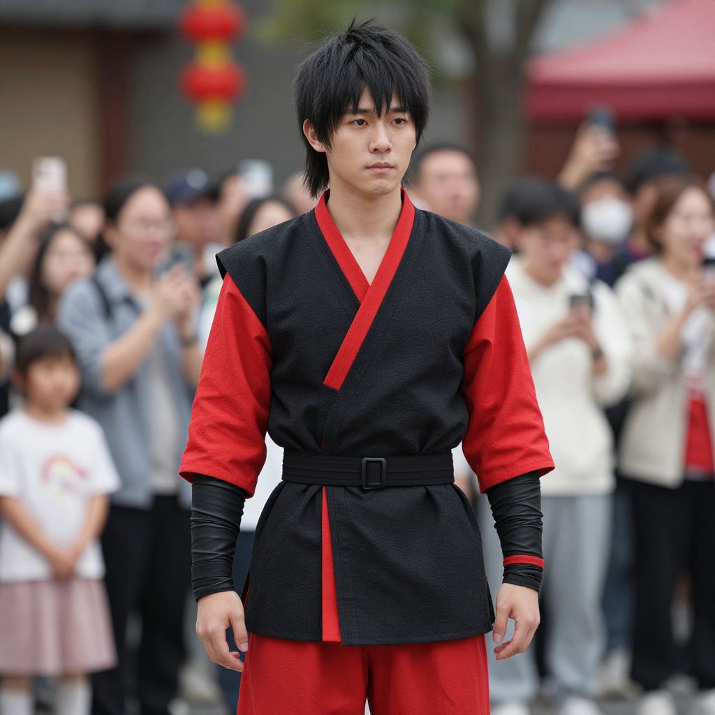 Sokka Costume Adult, asian man in black and red outfit standing in front of a crowd