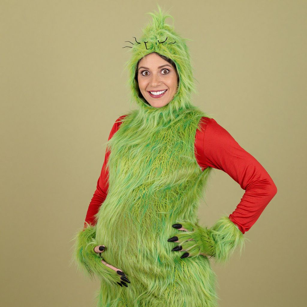 Maternity Grinch Costume, a pregnant woman dressed in a grin costume poses for a picture