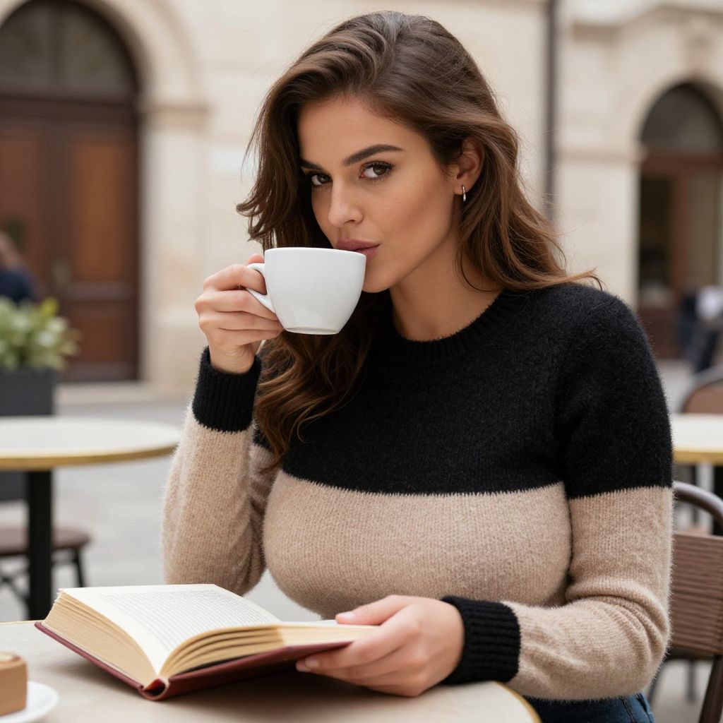 A busty woman in a color-blocked fuzzy sweater, black on top and beige below, enjoys a leisurely afternoon at a bistro table in a historic courtyard, sipping coffee and reading a book. Visual style: Pedro Campos. Sexy. Pretty face and beаutiful eyes. Big breasts