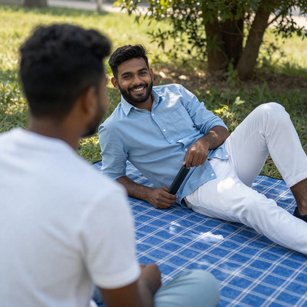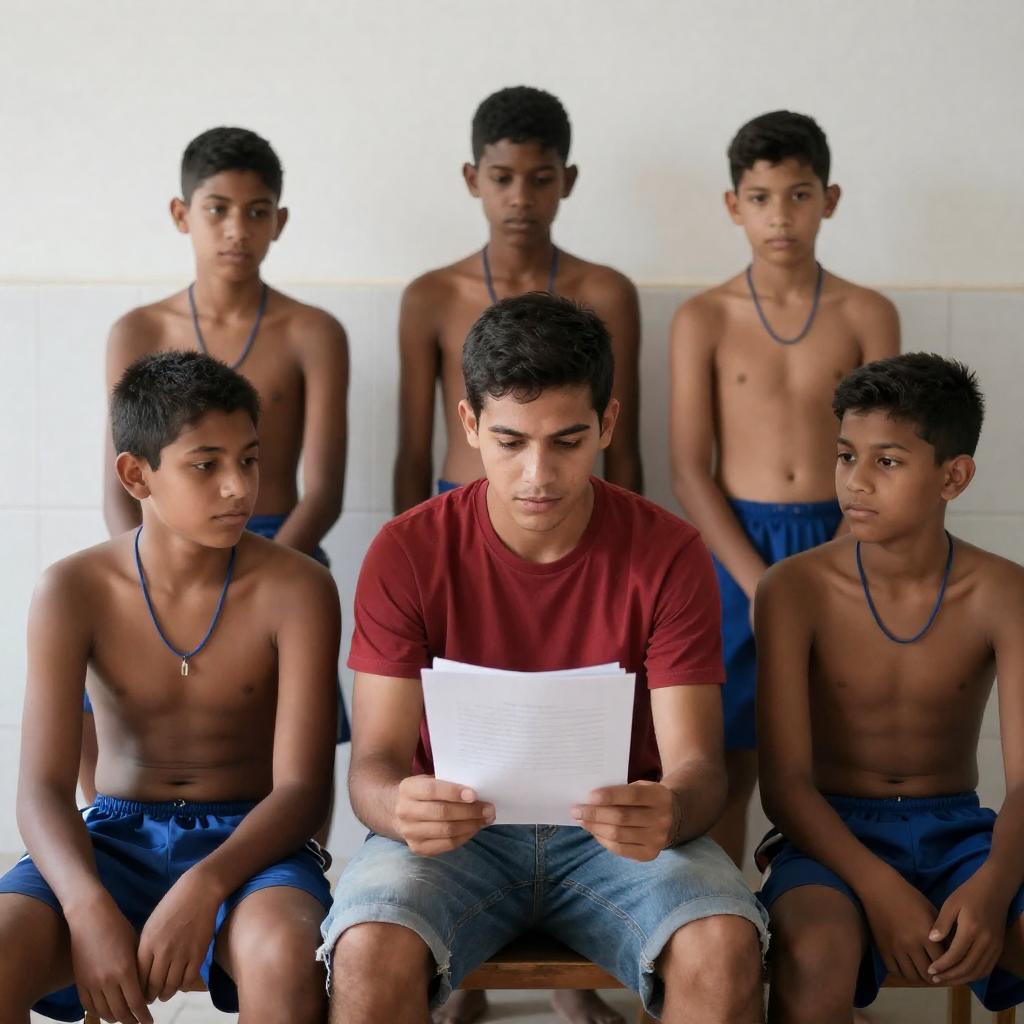 Photograph of a group of young men standing outdoors, listening to a man in a black and white checkered shirt. Central figure in white shirt with red and green shorts, necklace, and short black hair. Background: brick building.