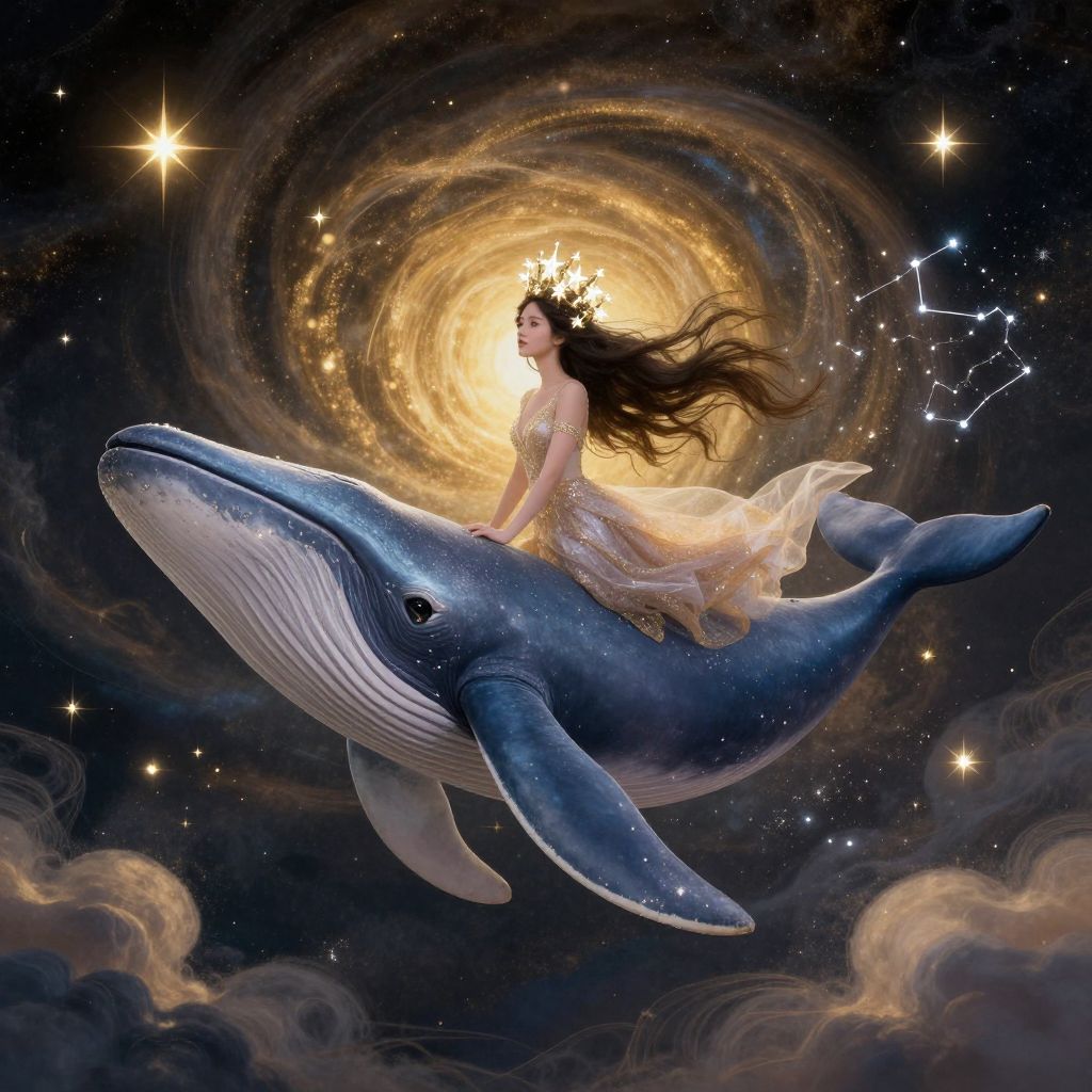 A mystical digital artwork depicts a woman adorned with a crown of living stars, gracefully riding atop a majestic sky-whale through a cosmic expanse filled with golden starlight and swirling clouds, her flowing hair trailing constellations in its wake.