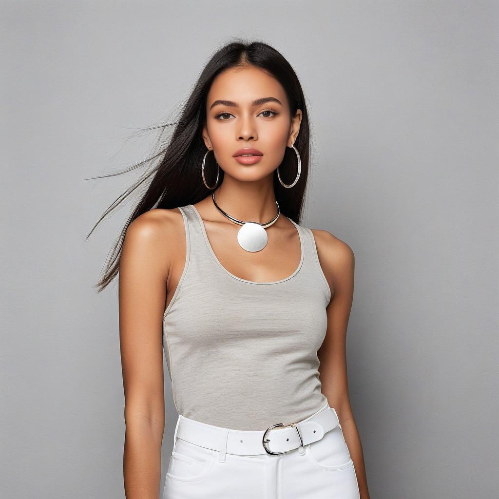 A young woman with long straight hair wearing a beige tank top and white pants, posing against a soft grey background, wearing large hoop earrings and a silver choker necklace, realistic photography style with soft lighting and natural tones, smooth skin texture