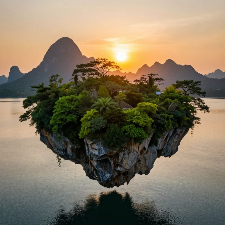 Photograph of a small, floating island with lush green trees and bushes, perched atop a rocky outcrop in the middle of a calm, reflective lake. The background features a vibrant sunset with a glowing orange and yellow sky, casting warm light over a range of dark, silhouetted mountains. The sun is partially hidden behind the mountains, creating a serene and picturesque scene. The island's reflection is visible in the still water below. The image has a surreal, almost magical quality, with rich colors and clear details.