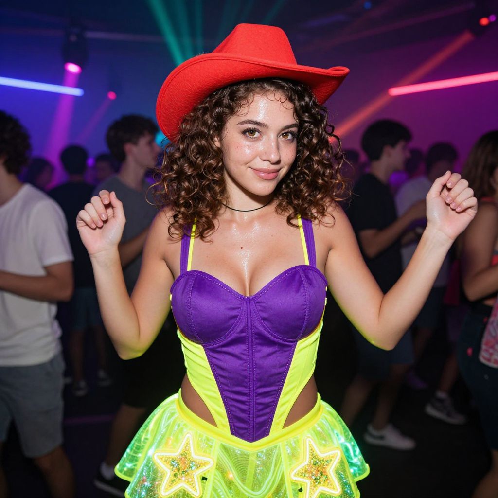 A young woman with curly brown hair, freckles across her nose, and warm amber eyes wears a full neon party outfit featuring a glowing purple and yellow corset top, glowing skirt with star-shaped neon panels, and a wide neon red cap, dancing energetically in a packed underground rave venue with colorful light beams and dynamic pulsing sound effects, sweat visible on her forehead.. The woman has big tits and cute face