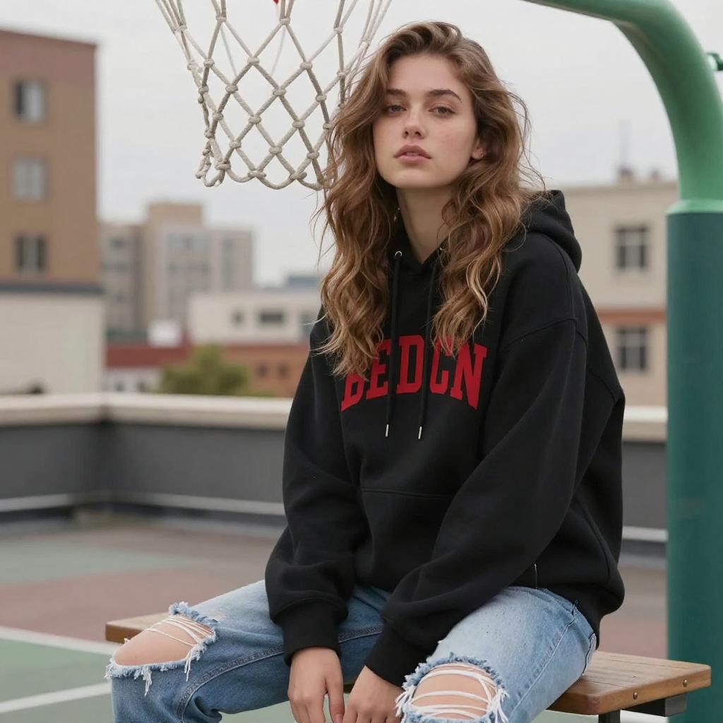 Photograph of a young woman with light brown, wavy hair sitting on a rooftop basketball hoop. She wears a black hoodie with red lettering and ripped blue jeans. Her expression is neutral, and she gazes slightly to the side. The white basketball net is in the foreground, with urban buildings blurred in the background.