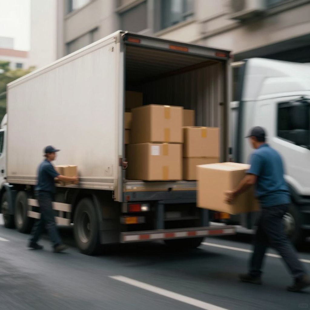 Photograph of a white delivery truck on a city street, with two male delivery workers in blue shirts and dark caps. The truck's rear is open, revealing several brown cardboard boxes stacked inside. The workers are in motion, one on the left side of the truck and the other on the right, both carrying additional boxes. The background includes blurred urban buildings and a white van to the right. The image has a slightly motion-blurred effect, emphasizing the movement. The street is dark gray with white lane markings.