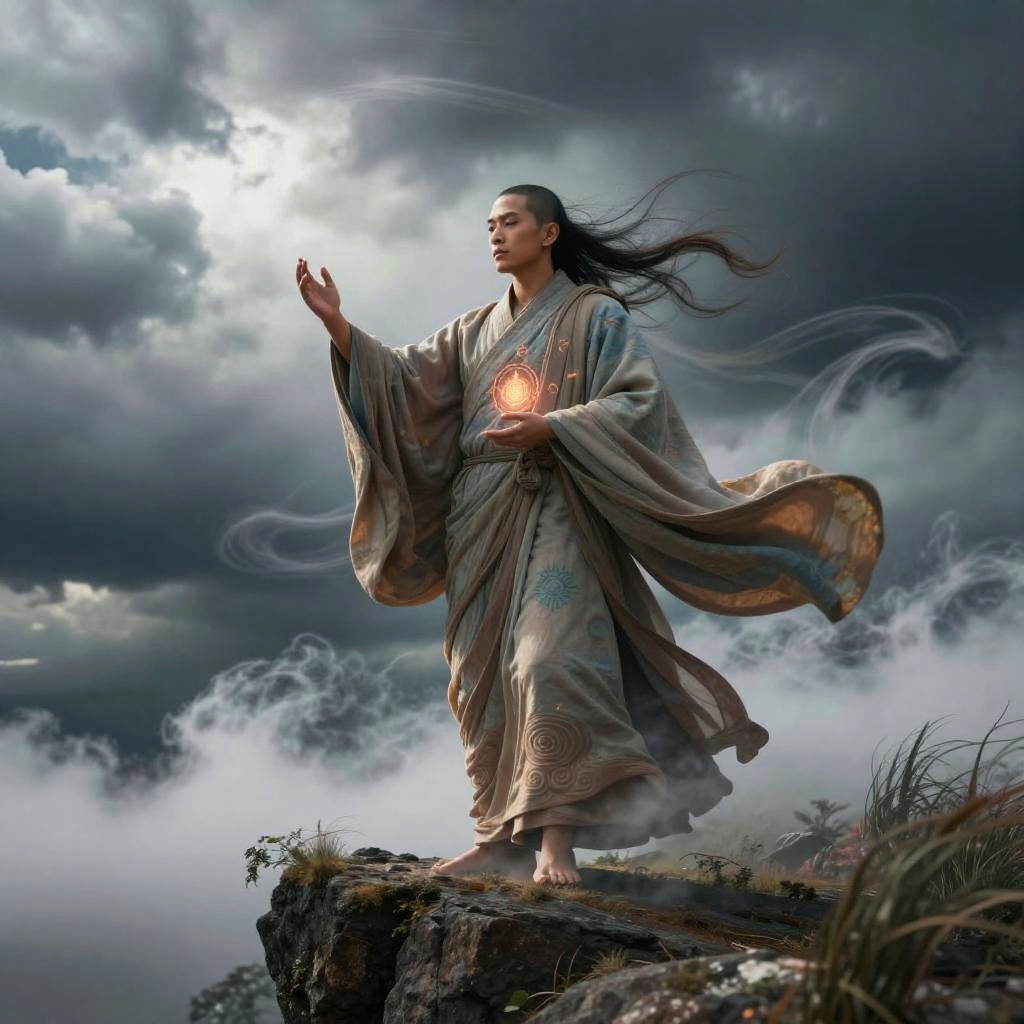 Digital art of an ethereal Asian woman in flowing robes, standing on a rock, holding a glowing orb, with dramatic, cloud-filled sky.