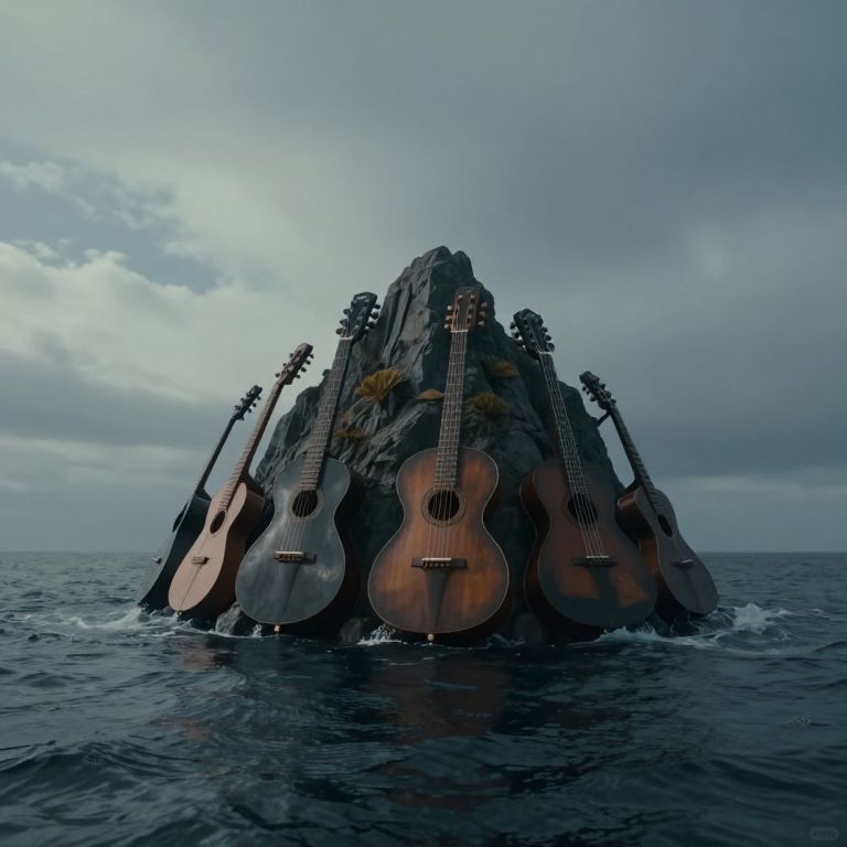 Photograph of a rocky island in the ocean, topped with an array of 12 acoustic guitars of various sizes and colors, including brown, black, and tan. The guitars are positioned around the rocky surface, some leaning and others standing upright. The sky is overcast with gray clouds, and the ocean water is dark blue with gentle waves around the island. The texture of the rocks is rough, and the guitars have a smooth, polished finish. The image has a surreal, almost magical quality due to the unusual combination of natural and musical elements.