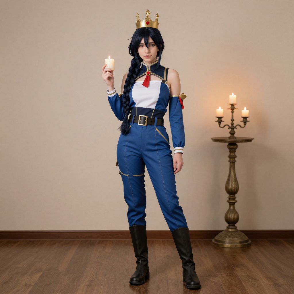 Cosplays costume, solo, candle, braid, 1girl, boots, standing, long sleeves, looking at viewer, full body, long hair, crown, indoors, blue pants, closed mouth, black hair, single braid, belt, candlestand, pants
