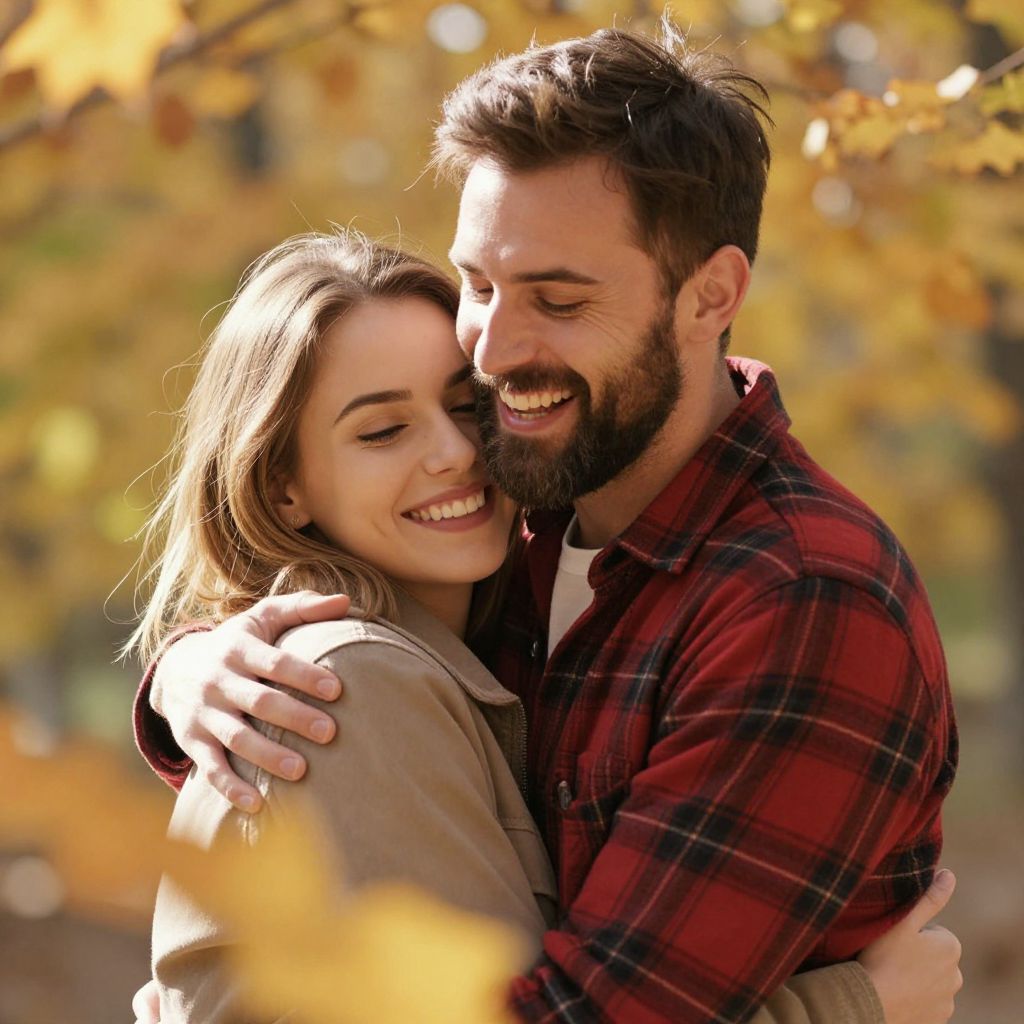 A bright, warm photograph of a bearded man with dark hair and a red plaid shirt, laughing joyfully while hugging a smiling woman with light brown hair. She's wearing a light brown jacket. They're surrounded by blurry, golden autumn leaves in the foreground and background, with sunlight filtering through, creating a cozy, happy atmosphere.