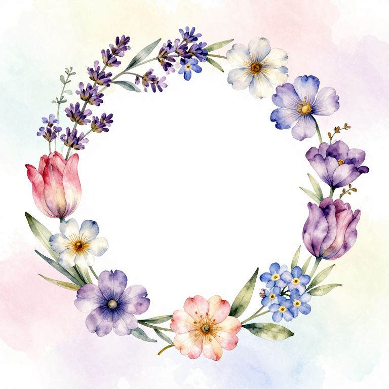 The image presents a delicate, clip art-style illustration of a ribbon of watercolor wildflowers, arranged in a circular frame. The flowers, including various species such as lavender, forget-me-nots, and tulips, are depicted with intricate details and soft, pastel colors. The composition is masterfully crafted, with the flowers and leaves interwoven in a harmonious pattern that creates a sense of movement and natural beauty. The background is a gradient of soft, muted tones, enhancing the ethereal quality of the artwork. The overall arrangement is balanced and symmetrical, with the flowers and foliage evenly distributed around the frame, creating a sense of unity and tranquility. The image exudes a sense of fragility and grace, capturing the delicate essence of wildflowers in a visually stunning manner.