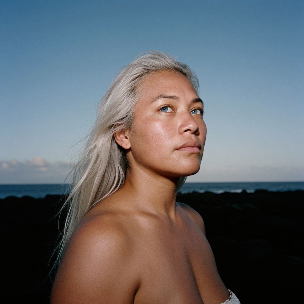 Visualize a portrait photograph, captured on film, of a Pacific Islander woman with striking blue eyes and flowing platinum hair. Illuminated by the gentle Arctic midnight sun, her stoic expression is accentuated from a low-angle perspective as she stands amidst an untouched landscape. Her gaze, fixed beyond the horizon where sky meets sea, conveys a profound connection to nature's wild solitude. The subtle interplay of light and shadow on her weathered skin evokes a powerful emotional gradient, suggesting contemplation, wonder, and resilience.