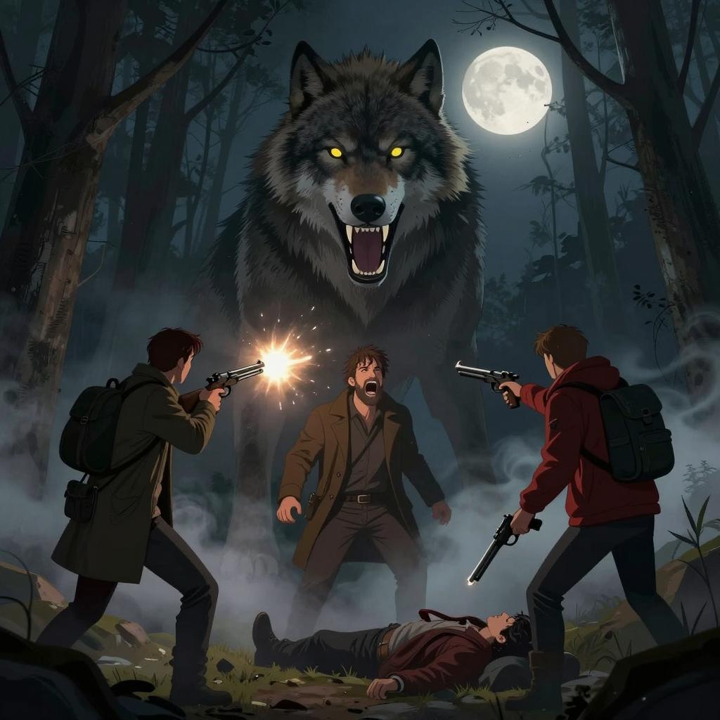 Digital illustration of a dark forest at night. Large werewolf with glowing yellow eyes and open mouth, baring sharp teeth, looms over three people. On the left, a man in a brown coat with a gun firing at the werewolf. In the center, another man with a beard, also in a brown coat, screaming. On the right, a person in a red jacket and backpack, pointing a gun downwards at a fallen person. Bright moon in the background. Smoky, eerie atmosphere.