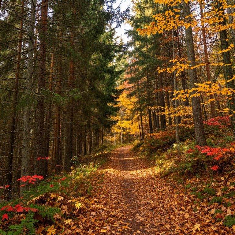 Photograph of a forest path lined with tall trees, vibrant autumn leaves in yellow, orange, and red, and scattered red flowers. Sunlight filters