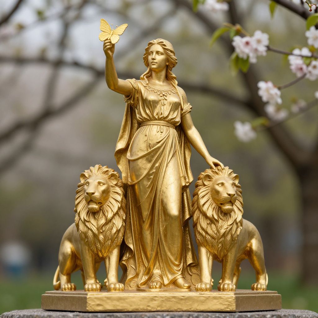 A golden statue of a woman holding a butterfly, accompanied by two lions, set against a backdrop of flowers and spring foliage.