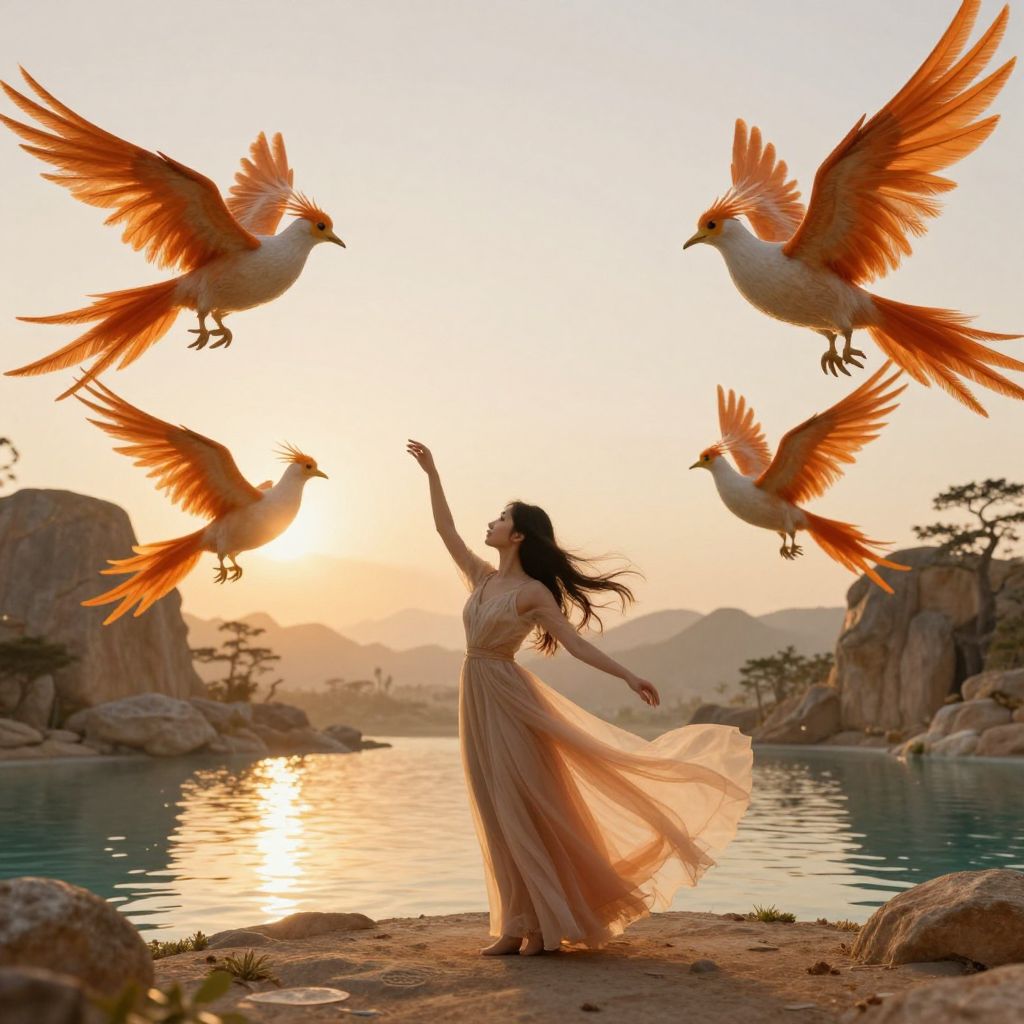 Photograph of a serene sunset scene featuring a silhouetted woman with long black hair, wearing a flowing, light beige dress, standing on a rocky shore by a calm lake. Four vibrant orange and white birds with outstretched wings are mid-flight around her, creating a dynamic contrast against the golden sky. The background includes distant mountains and scattered rocks. The water reflects the soft, warm hues of the sunset. The woman's right arm is raised, and her dress billows slightly, adding a sense of movement. The overall atmosphere is magical and ethereal.