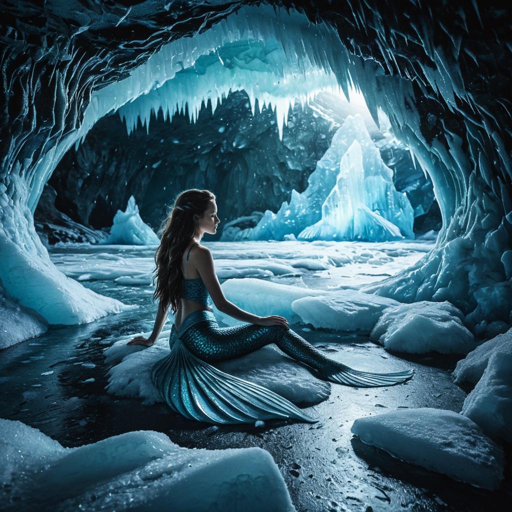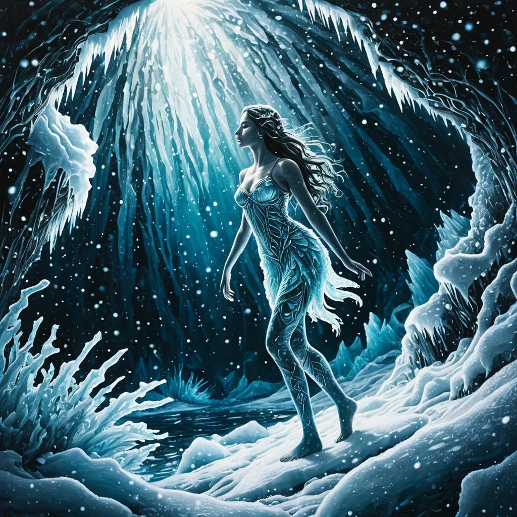 Ice painting of frosthound surrounded by a glacier field, with glowing icy tones and highly detailed textures.