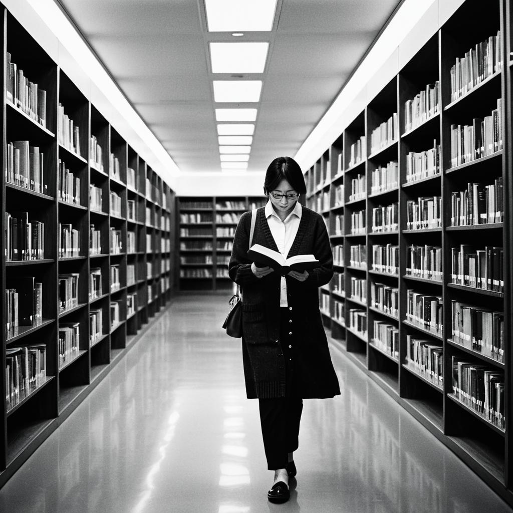Black and white photo of an Asian female librarian wearing glasses, a white shirt, and a long cardigan, walking down a well-lit aisle between tall bookshelves in a modern library. The woman is holding and reading a book while walking, reflecting a calm and introspective mood. The smooth, reflective floor and symmetrical bookshelves add a minimalist, orderly atmosphere.