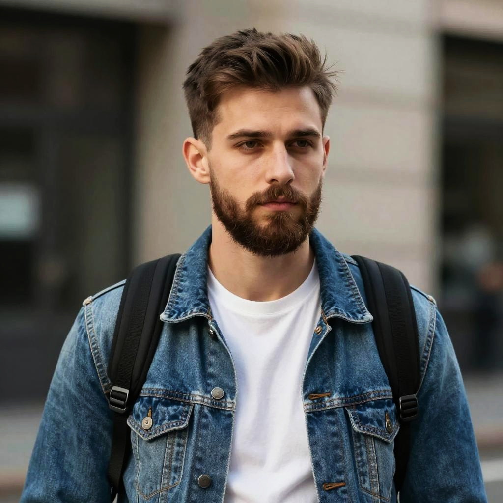 How would I look like with a beard? Create a realistic portrait of a young man with a thick, well-groomed beard, soft lighting highlighting facial features, casual clothing, neutral background, photorealistic style.