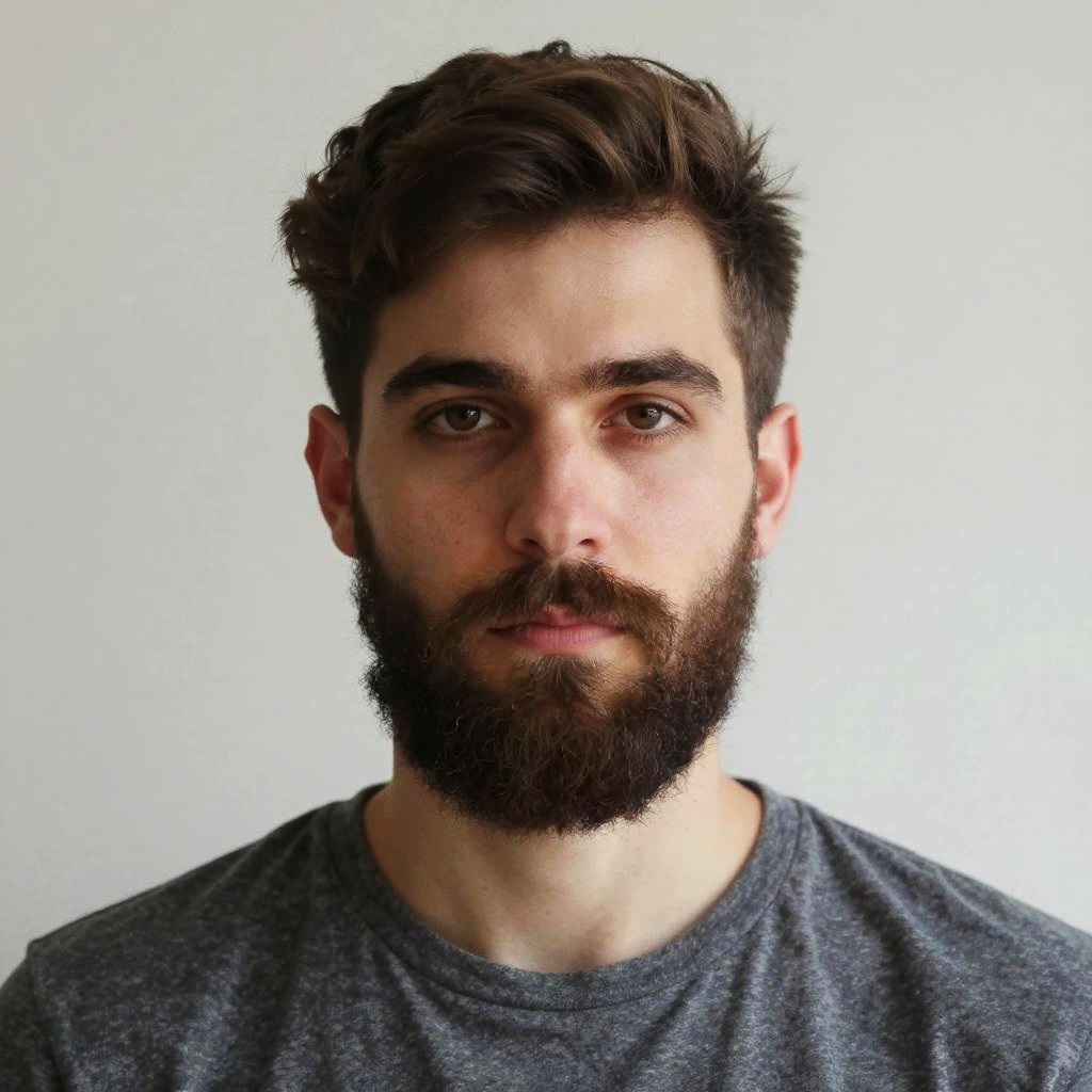 Photograph of a young white man with a medium build, dark brown, slightly wavy hair, and a full, thick beard. He has medium-sized, dark brown eyes and a neutral expression. He is wearing a gray, crew-neck t-shirt made of a soft, heathered fabric. The background is a plain, light gray wall, providing a simple, unobtrusive backdrop that emphasizes his facial features and beard. The lighting is even, highlighting his skin tone and the texture of his hair and beard. The overall style is natural and unfiltered.
