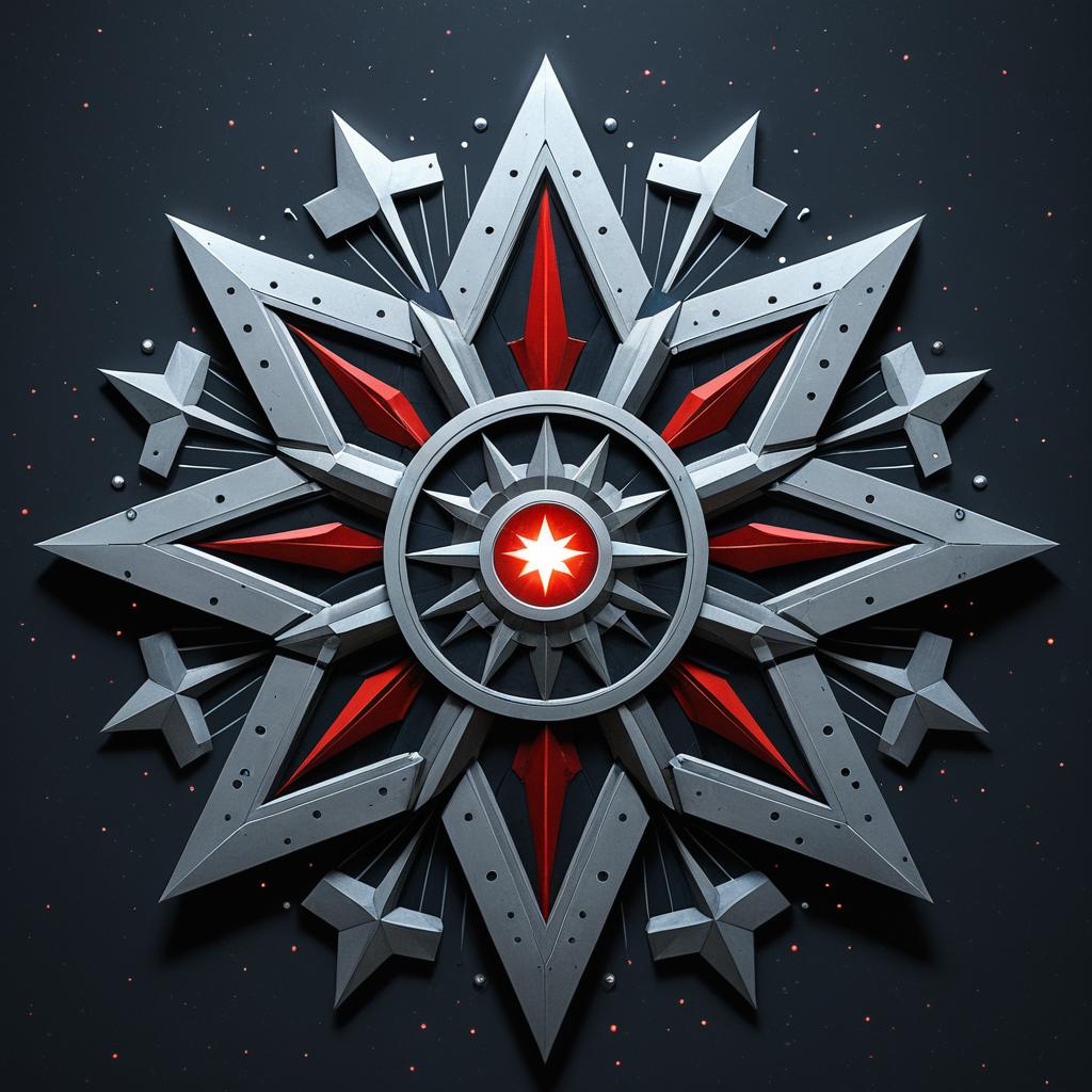 Detailed digital artwork featuring an intricate starburst pattern in soft grey and red hues. The design is symmetrical with sharp, pointed elements radiating from a central glowing star, showcasing smooth texture and sharp focus. Inspired by concept art styles of Greg Rutkowski, Luis Rollo, Uang Guangjian, and Gil Elvgren.