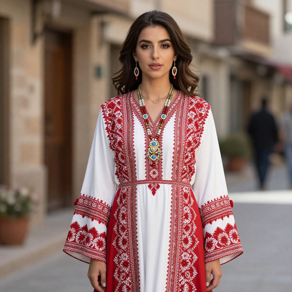 "Traditional Lebanese Dress, woman in a white and red dress and a necklace"
