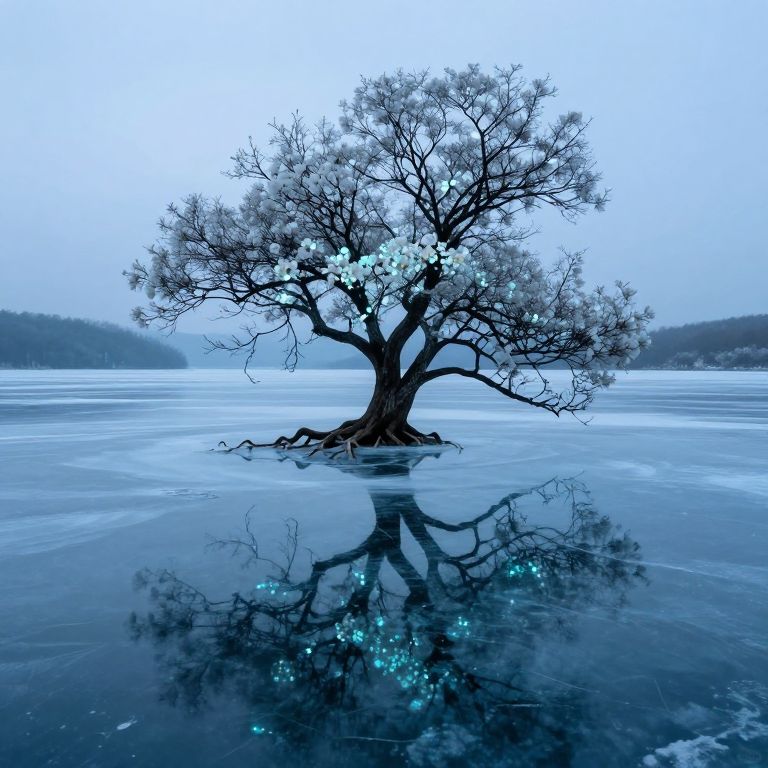Photograph of a solitary, leafless tree standing in a serene, icy lake. The tree is adorned with clusters of white blossoms and its reflection is mirrored perfectly in the still water. The lake's surface is partially frozen, creating a glass-like texture. The background features a misty, foggy horizon with faint, dark forested hills. The overall color palette is cool, with shades of blue and white dominating the scene, evoking a tranquil, almost ethereal atmosphere. Glowing blue bioluminescent lights are scattered beneath the tree's reflection, adding a magical element to the image.
