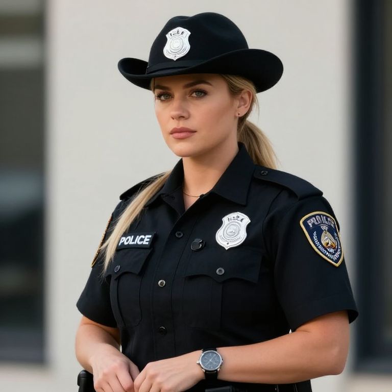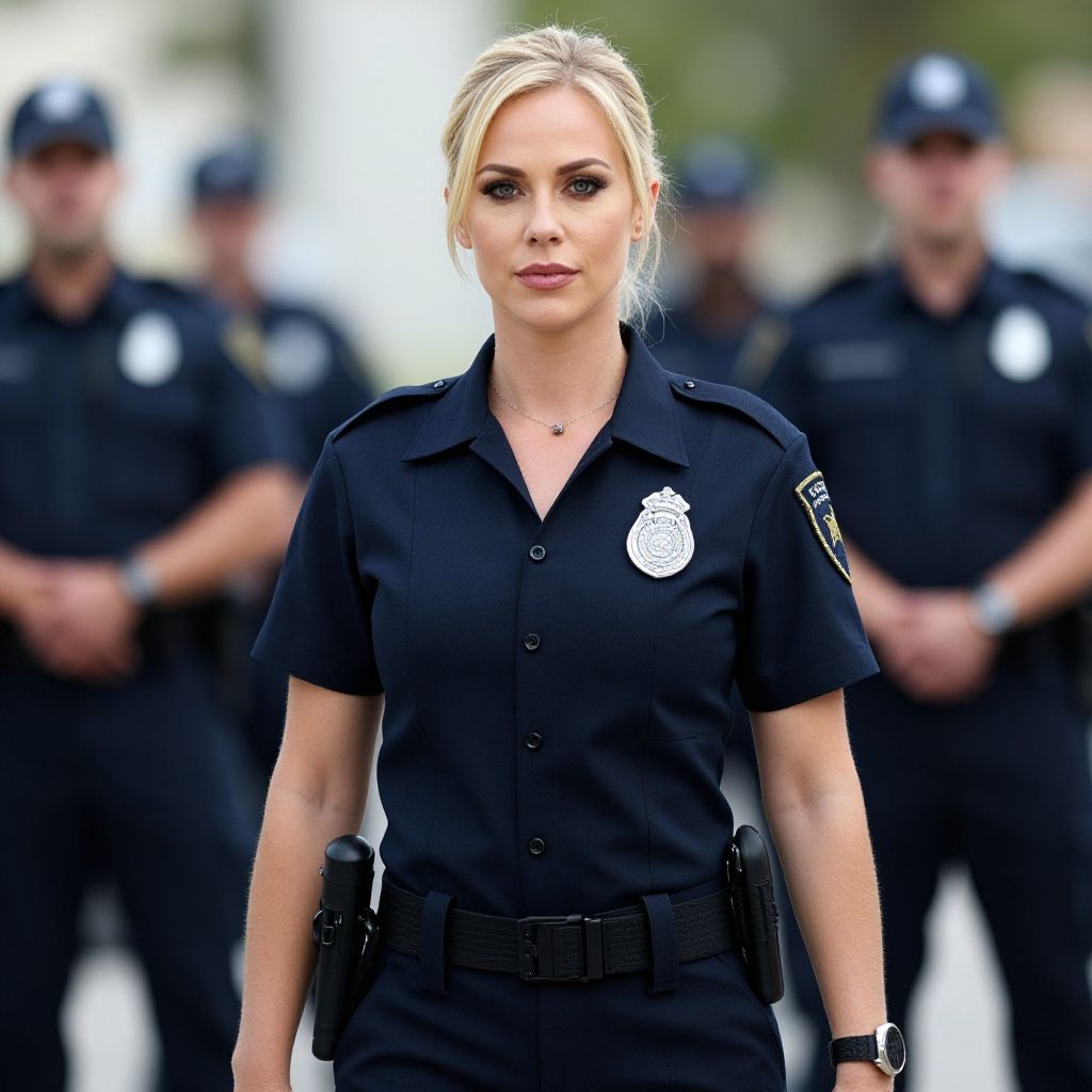Female police officer, wearing a black uniform with a badge on the left side and a black hat on her head. She has long blonde hair and is wearing a watch on her left wrist.