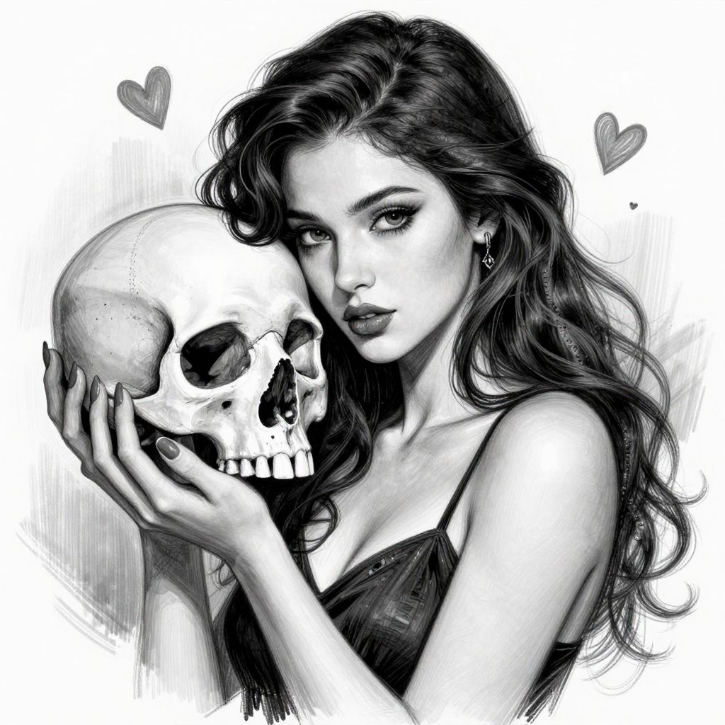Black-and-white digital drawing of a beautiful woman with long wavy hair, holding a skull, wearing a strapless top, with heart shapes in the