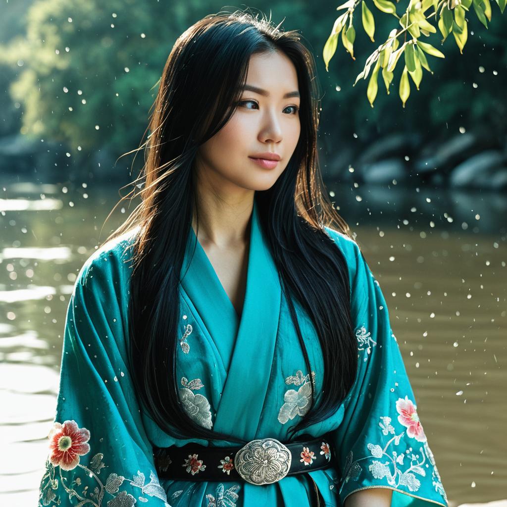 A photorealistic 3D portrait of a asian female river guardian, wearing traditional turquoise silk robe with floral embroidery and silver belt, styled with long black flowing hair textured with water droplets and peaceful expression, captured with 60mm lens with soft diffused sunlight, ultra-detailed and realistic