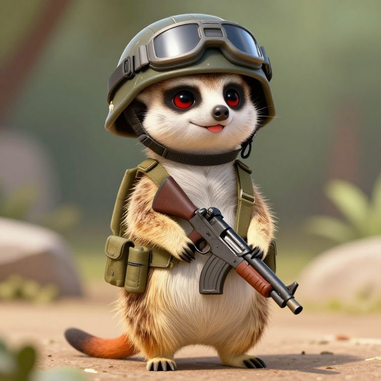 A cute meerkat dressed in army gear, holding a gun and wearing a helmet, stands confidently with a red eye and a charming smile.