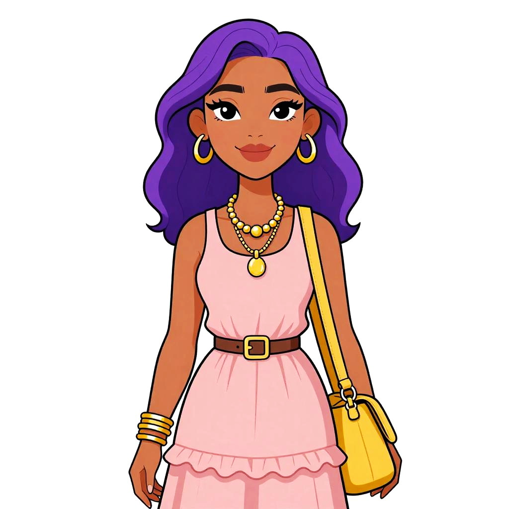 Woman with pretty face and pretty hair. smiling Woman, bohemian, white sleeveless crop top with a relaxed fit, layered necklaces with pendant, long flowing skirt with a vibrant pink and purple tie-dye pattern, high-waisted, lightweight fabric, floor-length. --sref 1467