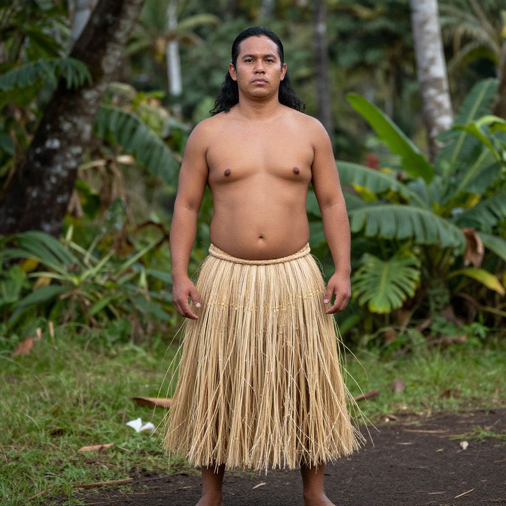 Photograph of a shirtless, medium-built man with dark hair and brown skin standing on a dirt path in a lush, tropical forest. He wears a yellow, grass-like hula skirt, exposing his bare chest and abdomen. His expression is neutral, and he stands with his arms relaxed by his sides. The background features large, green banana leaves and palm trees, creating a dense, verdant setting. The lighting is natural, highlighting the vivid colors and textures of the forest and the man's attire.