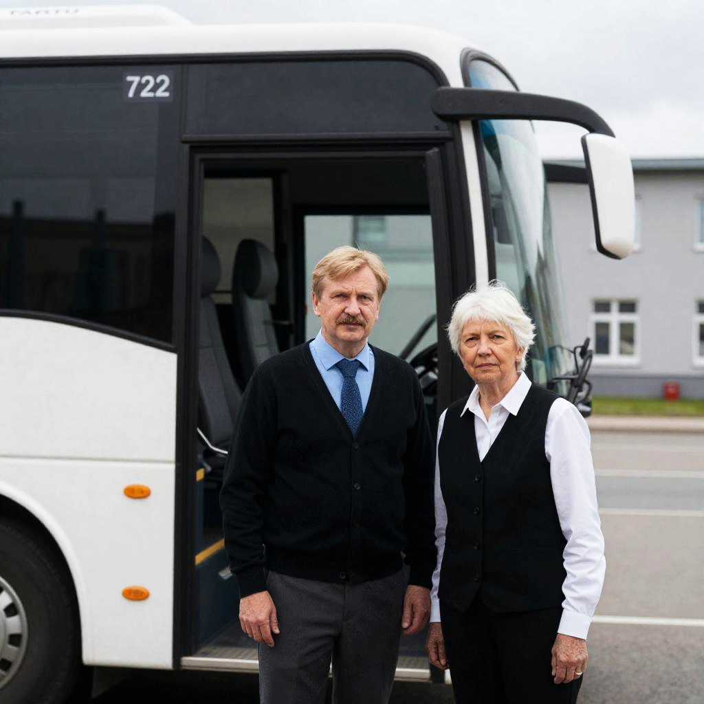 Photograph of two people standing beside a white bus labeled "722" and "TARTU". A middle-aged man with blonde hair and a mustache wears a black cardigan over a blue shirt and tie. A white-haired woman in a black vest over a white shirt stands next to him. Bus door is open. Background includes a gray building and overcast sky. Both people have neutral expressions.