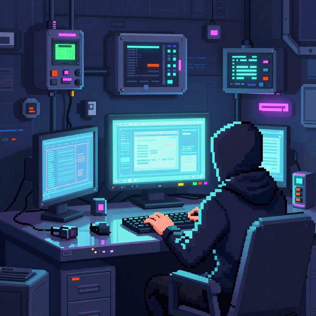 Pixel art of a hooded person typing at a dark, neon-lit control station with multiple glowing screens and tech equipment.