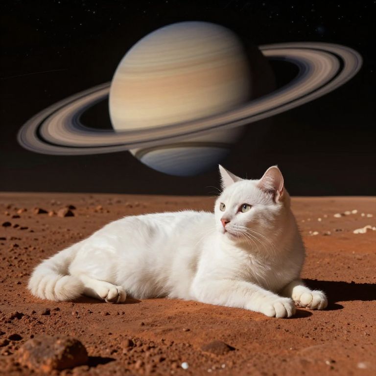 A serene white cat reclines gracefully on the rust-hued surface of Mars, gazing thoughtfully toward Saturn's majestic rings, as if contemplating the cosmos from its celestial perch.