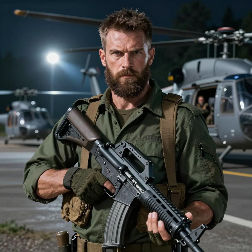 Photograph of three muscular men with long hair, shirtless, standing beside a military vehicle in a forested area. The man in the foreground holds a large rifle, looking alert. Two other men, one with curly hair and one bearded, work on the vehicle. Black smoke rises in the background.