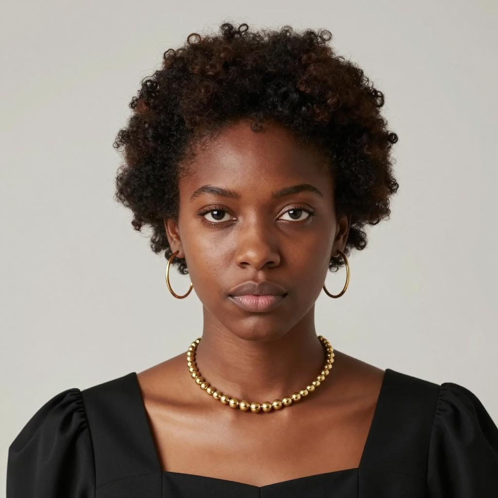 Close-up portrait of a beautiful Black woman with medium skin tone, styled in short afro spring twist dreadlocks with one side pulled up. She wears large hoop earrings, a light brown choker, and an off-shoulder beige top with puffy sleeves. The background is brown and the lighting is soft, highlighting her smooth skin and minimal makeup for a natural, elegant look.
