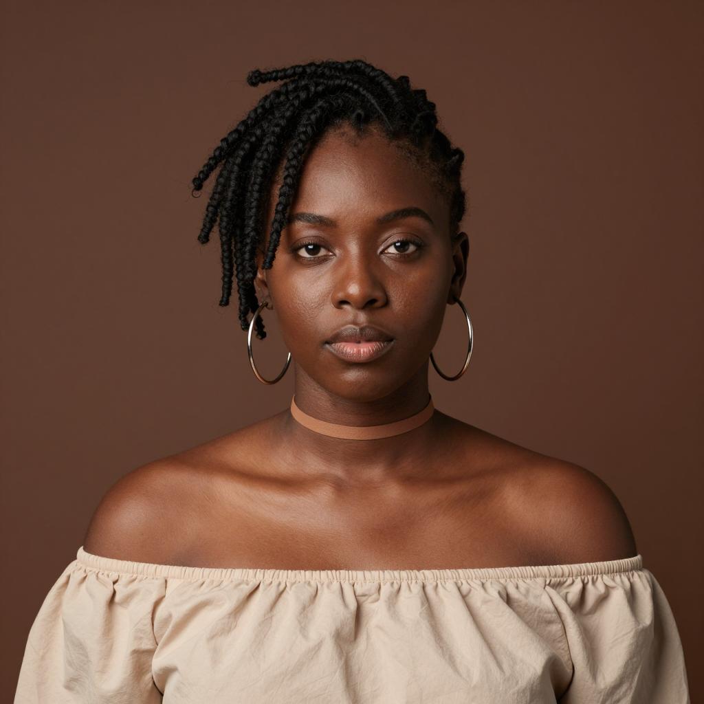 Afro spring twist hairstyle, photograph of beautiful black woman, portrait, head and shoulders, brown background, medium skin tone, short dreadlocks with one side pulled up, large hoop earrings, wearing off-shoulder beige top with puffy sleeves, light brown choker, looking directly at camera, neutral expression, smooth skin, soft lighting, minimal makeup, elegant, stylish, simple background, focused on subject, realistic, natural style