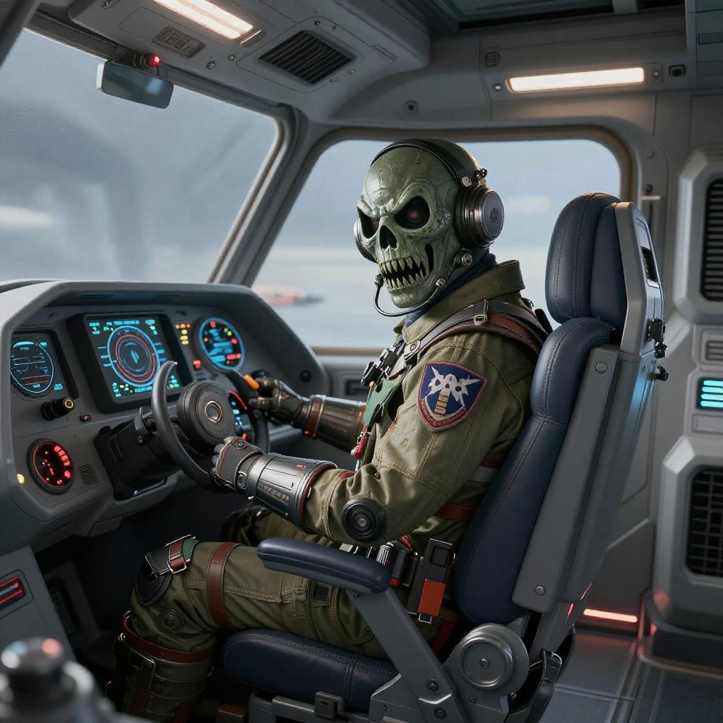 Scarymonstersv2 headed pilot, flying a spaceship, futuristic controls, hyper realistic, 8k, photo realistic, hyper detailed, sat in a pilot seat, no_unrealistic768