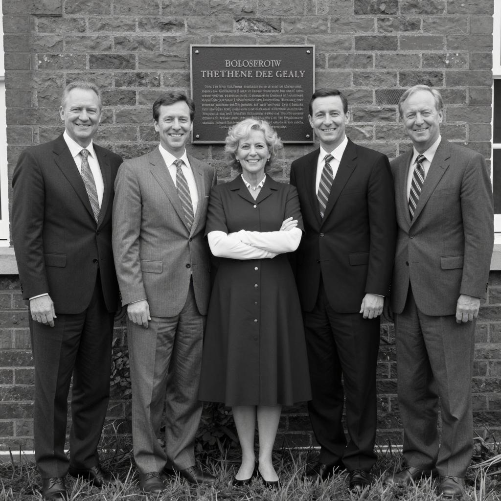 Black-and-white photograph of four people standing in front of a brick wall. Four men in suits, one woman in a dark dress and white gloves, arms crossed. Wall has a plaque. All smiling. Woman in center, men on sides. Grass at base.