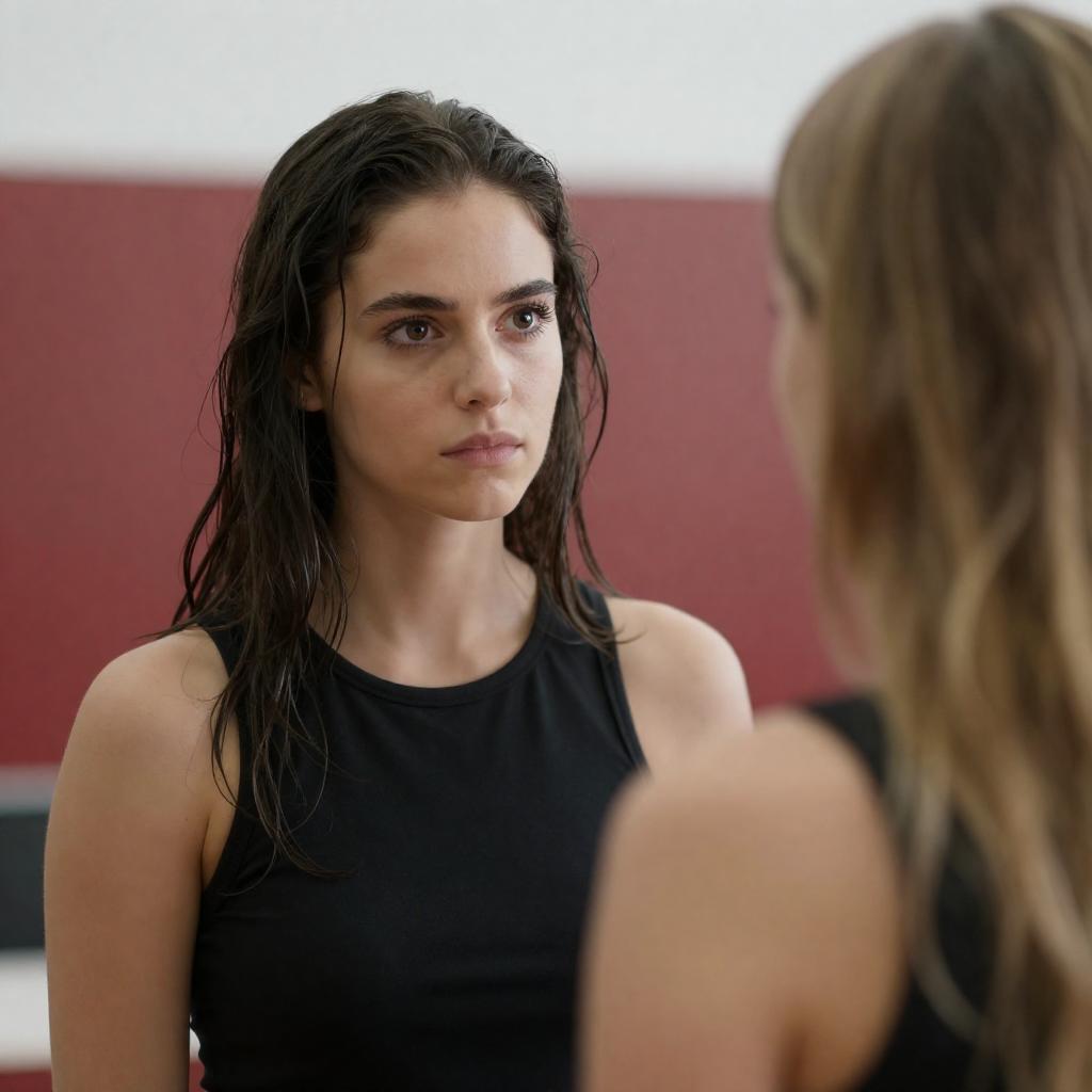 Photograph of a blonde woman with shoulder-length hair, wearing a tight, dark blue, long-sleeve bodysuit with black gloves, crouching slightly with a focused expression. She is in front of a wooden-paneled wall, with a blurred figure in the foreground on the left.