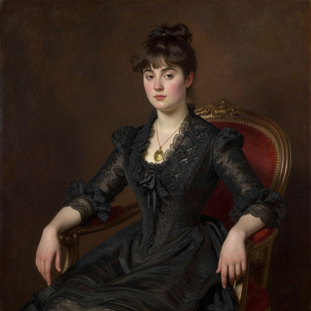 Seated elegantly in a richly upholstered red chair, a woman adorned in a dark, Victorian-era gown with intricate lace detailing and a golden pendant necklace exudes timeless grace against a deep brown backdrop, embodying the refined style captured by Lord Frederick Leighton in *The Countess Brownlow* (1879), an oil painting on canvas.